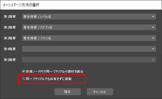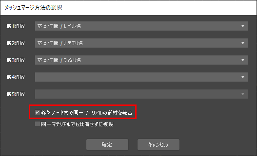 メッシュのマージ方法の選択ダイアログが出てくるので、どのような階層構造でメッシュをマージするか決定し確定ボタンを押します