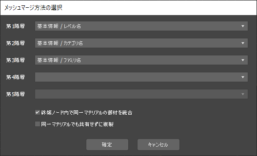 メッシュマージ方法の選択ダイアログでどのような階層構造でメッシュをマージするか決定し確定ボタンを押します