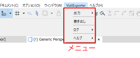 ExporterはARCHICADのメニューバーの「VizitExporter」メニューに配置されます。