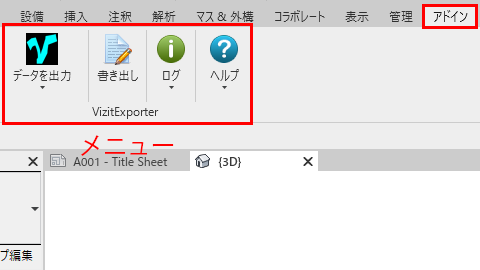 ExporterはRevitの「アドイン」内の「VizitExporter」パネルに配置されます。