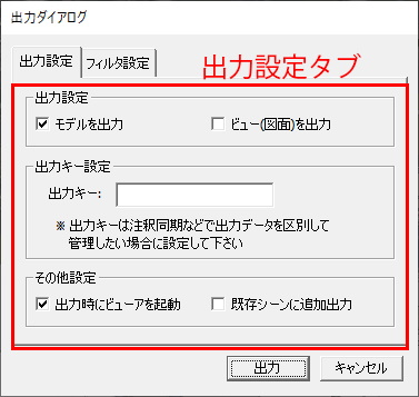 - ※「出力設定」タブの「ビュー(図面)を出力」がOFFの場合は、利用頂けません。