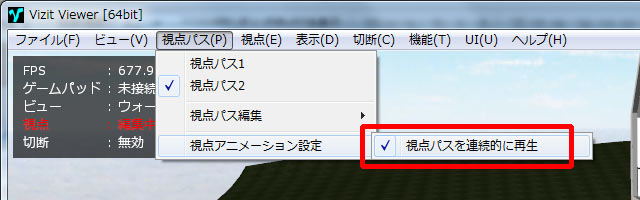 「視点パス/視点アニメーション設定」メニューの「視点パスを連続的に再生」を有効にすると入力された全ての視点パスを順番に再生します。