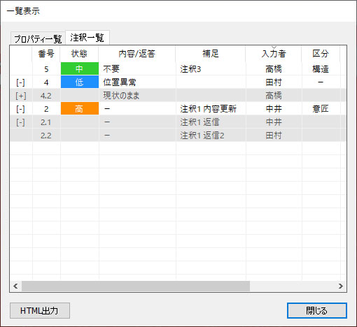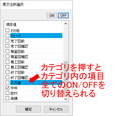 表示させたい項目をチェックして「確定」を押すと項目に合致する注釈のみViewerと一覧表示ダイアログに表示されます。