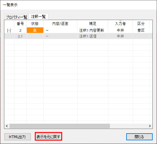元に戻す場合は一覧表示ダイアログの「表示を元に戻す」を押してください。