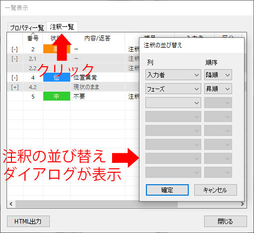 カラムヘッダをクリックすると「注釈の並び替え」ダイアログが表示され、各項目での昇順/降順ソートを編集できます。