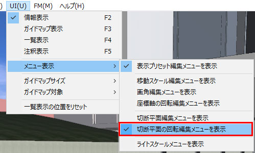 「UI」メニューの「メニュー表示」より「切断平面の回転編集メニューを表示」を選択します。