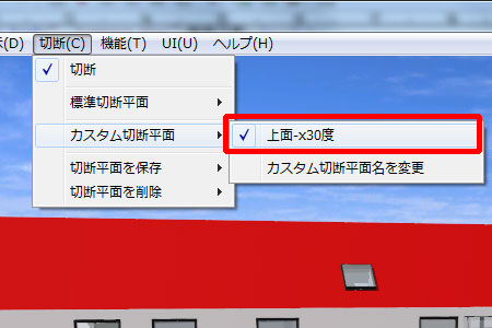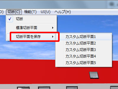 保存した切断平面は「切断」メニューの「カスタム切断平面」より読み出し可能です。