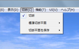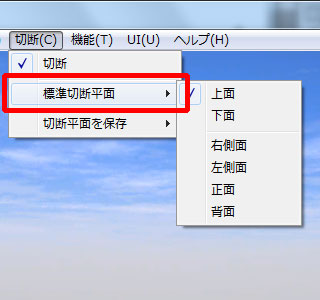 「切断」メニューの「標準切断平面」より切断したい平面を選択します。