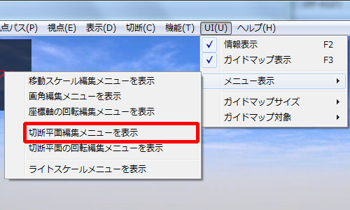 「UI」メニューの「メニュー表示」より「切断平面編集メニューを表示」を選択します。