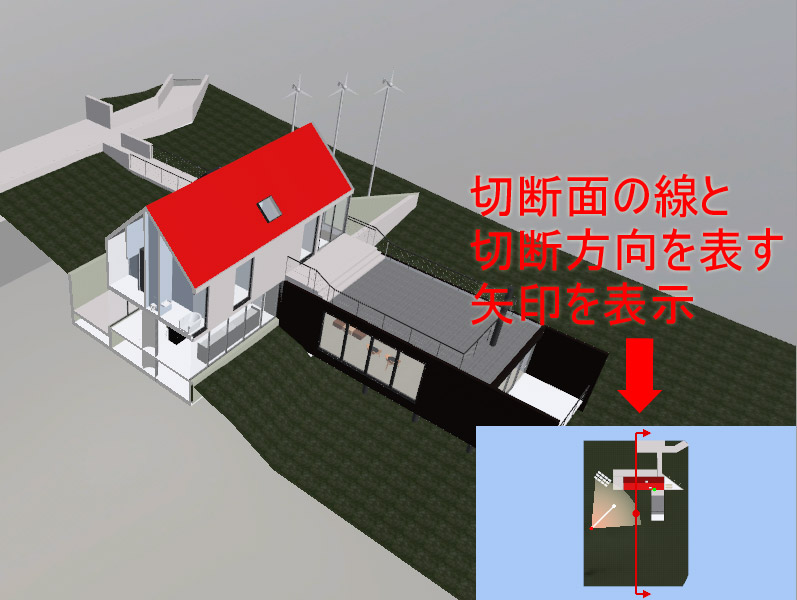 切断が「上面」「下面」以外の場合はガイドマップ上に切断面を表す赤い線と、その両端に切断方向を表す矢印を表示します。