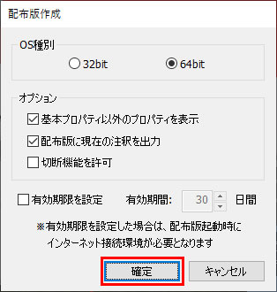 設定ダイアログで配布版の設定をして「確定」ボタンを押します。