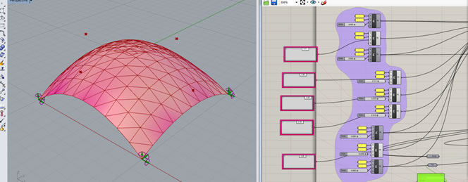 近年、建築デザインにおいて、3Dモデルによる高度なコンピュテーショナルデザインが着目されている。3次元の自由曲面モデラー「Rhinoceros」とそのプラグインである「Grasshopper」により、複雑な建築デザイン、幾何学制御、構造解析、環境シミュレーションなどのさまざまなエンジニアリングを統合化できる可能性を秘めている。弊社が開発した開発したShellOPTでは、曲面のコントロールポイントで制御された一枚の面に対し、そのZ方向の座標を設計変数とし、重量と重力に対する鉛直変位の2つを目的関数とし、多目的最適化を行うシステムである。「Rhinoceros」+「Grasshopper」はさまざまな可能性を有し、汎用性が高く、応用できる事例が多いため、今後ますます利用され、構造設計への展開については、骨組構造、シェル構造など形状に問わずコンペ、基本設計などいろいろなアイデアを短期間で出す際にも非常に有効であり、実施設計の詳細な検討を行う中でも十分に威力を発揮できる。詳細な内容は、コラム1を拝見ください。