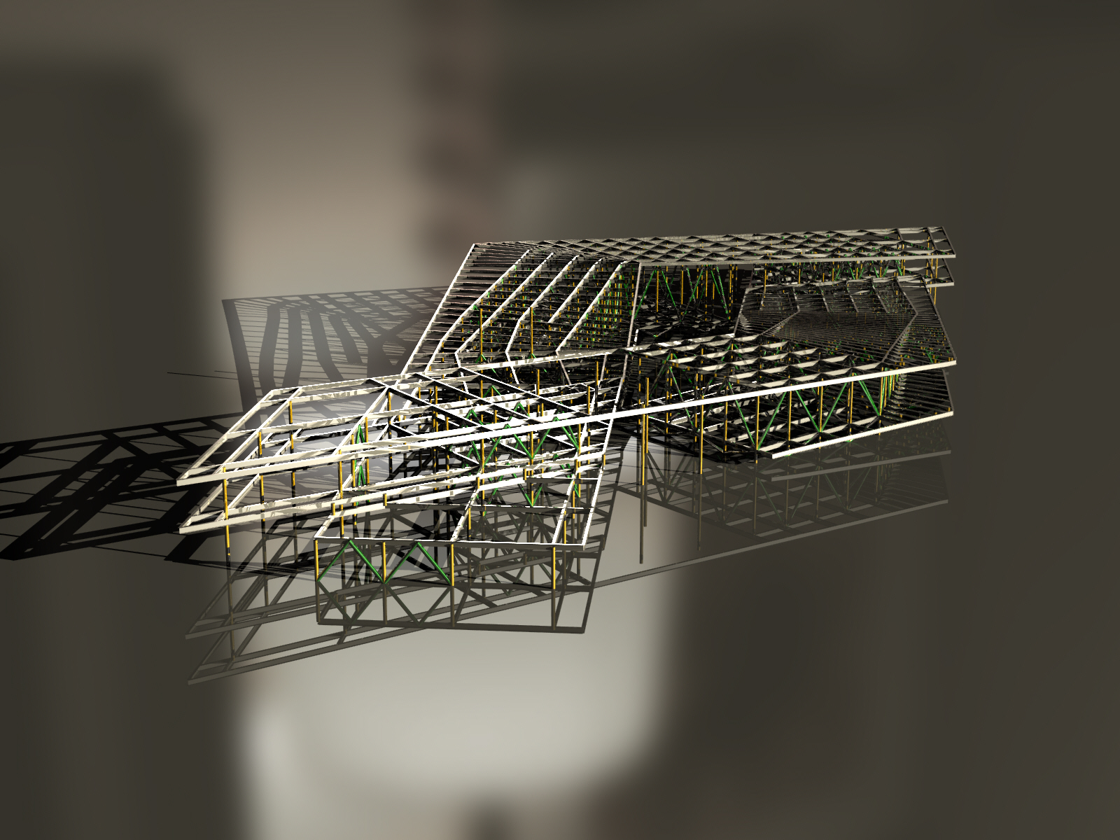 折れ曲がった二つのチューブが組み合わされた構造体の構造形式は鉄骨造とする。 構造主体フレームは柱。梁、ブレースで構成し、固定荷重、積載荷重、積雪荷重、地震荷重に対して、堅固な構造体とする。 Long Span Truss Tube は、外壁側に、屋根と床の間にトラス機構を形成し、スパン 20m ~ 40m の屋根および床を支える。 Braced Core は、水平力に抵抗する構造要素であり、構造躯体の剛性を確保し、鉄骨量の軽量化を行い、経済的な構造とする。