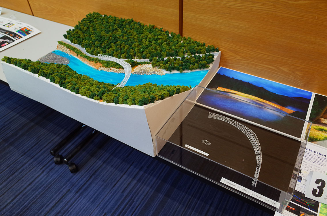 本提案は、廃線跡地を利用して失った地域の交通インフラを遊歩道として蘇らせるとともに、「自然の体幹装置としての新たなインフラ=地域の拠点」を整備する計画である。居場所としての橋梁をテーマに、多様な内部空間を寛容する構造形態のデザインを行った。